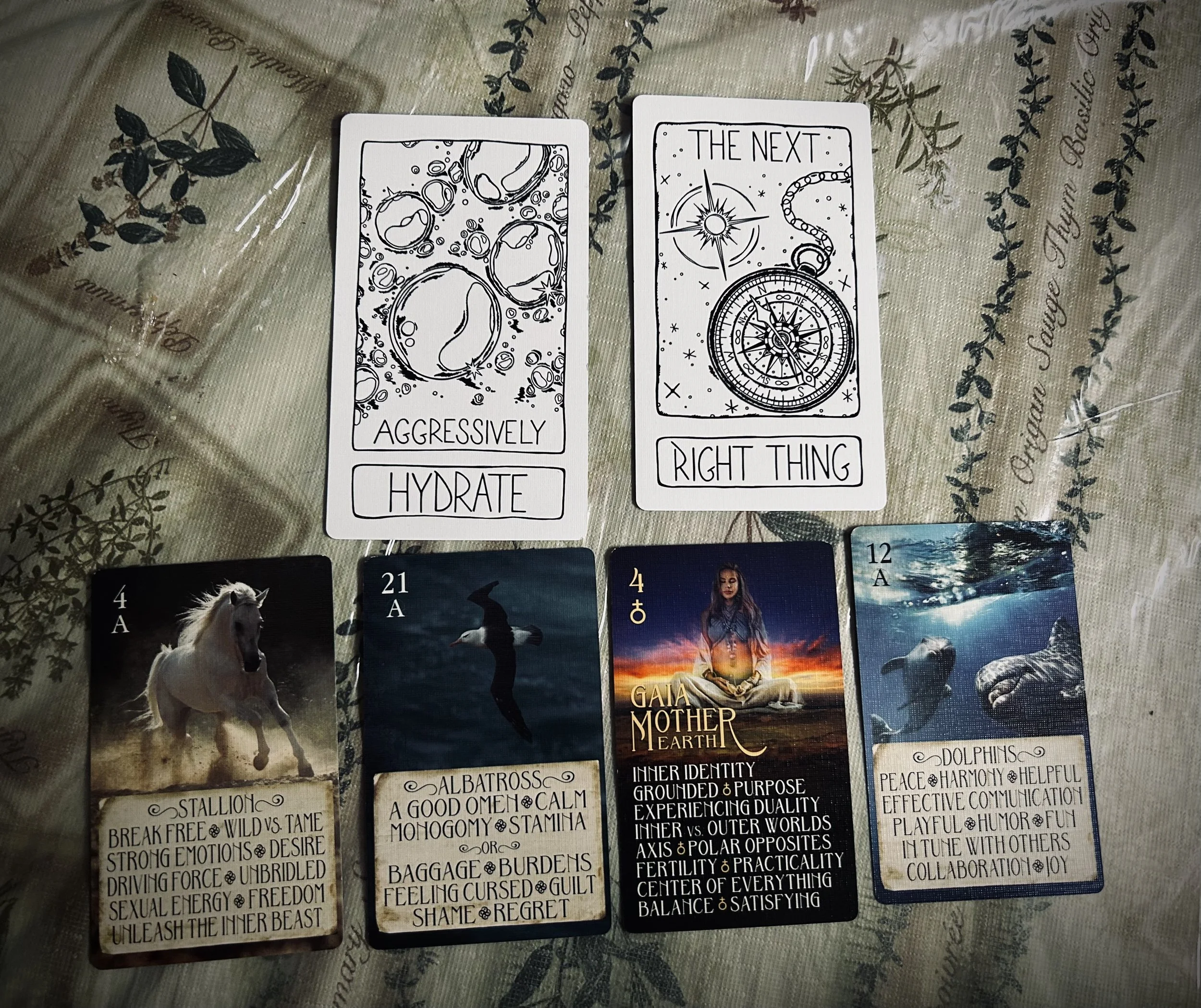 Whew, Pile two— Like the card says, aggressively hydrate! Y’all need some water, ASAP! Y’all made me get some water lol. But all jokes aside, you guys have to take better care of yourselves. I feel like this group has been neglecting their health, neglecting their needs. I’m hearing “You need to rest!” Rest your body, rest your brain. A lot of y’all have been doing way too much, and if you aren’t careful, it’s gonna catch up with you— spiritually, mentally, emotionally, and physical. I saw someone passing out in the back of my mind. Please take care of yourselves. Dry skin, dry scalp, dry hair— you need to hydrate from within. Go drink some water, now!